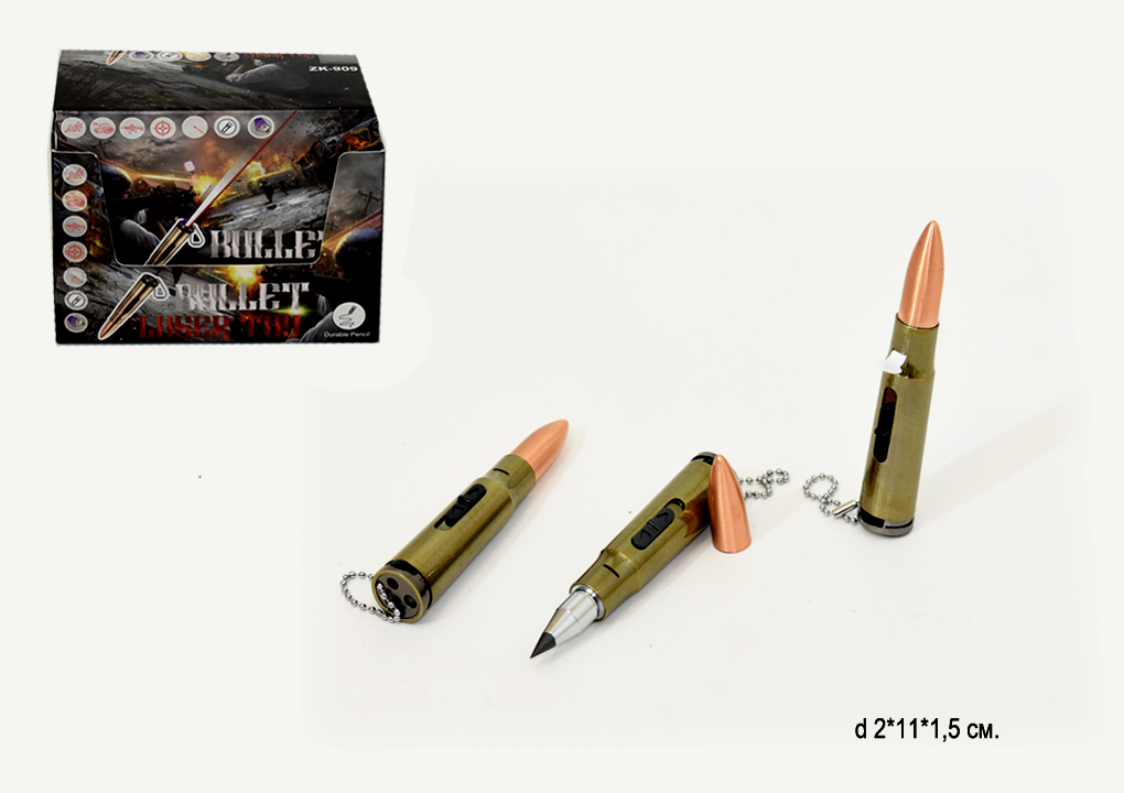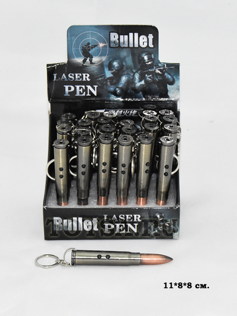 - Фонарик арт. 907 Пуля лазер (24 шт.) в кор._°=×Фонарик арт. 907 Пуля лазер (24 шт.) в кор._°=Брелок - патрон выполнен в виде патрона автомата Калашникова калибра 7,62 . Корпус изготовлен из пластика, на котором закреплено кольцо для ключей. При снятии пулевидного наконечника брелок можно использовать в качестве шариковой ручки . Так же функционал брелка патрона предполагает его эксплуатацию в качестве лазерной указки и карманного фонарика.