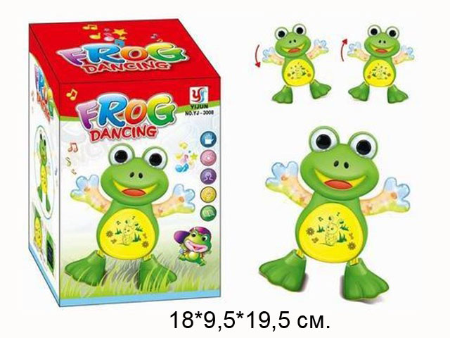 - Лягушка арт. 3008-YJ" На батарейках в кор. 18*9,5*19,5×Лягушка арт. 3008-YJ" На батарейках в кор. 18*9,5*19,5Интерактивная игрушка "Танцующая лягушка" отлично развлечет ребенка благодаря своей функциональности. Этот забавный симпатичный лягушонок, сделанный из прочного пластика, может танцевать в такт веселым мелодиям, которые он воспроизводит благодаря встроенному музыкальному модулю. Звуковые эффекты игрушки дополнены загорающимися лампочками.
