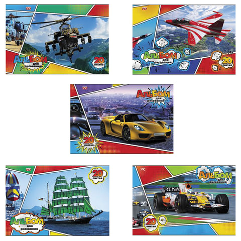 Содержит 20 листов плотностью 100 г/м2 формата А4 (202х285 мм). Красочная обложка выполнена из мелованного картона. Скрепление листов осуществляется с помощью скрепки. Подходит для смешанных техник рисования: красками, карандашами и фломастерами.