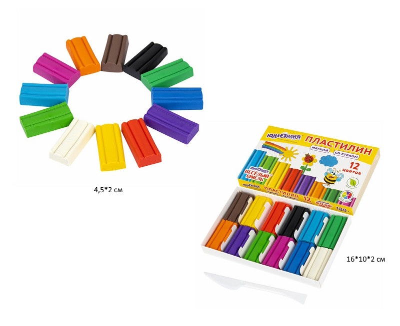 Пластилин мягкий арт. 106672 ЮНЛАНДИЯ "ВЕСЕЛЫЙ ШМЕЛЬ", 12 цветов, 180 г, СО СТЕКОМКоличество цветов в наборе: 12 шт.