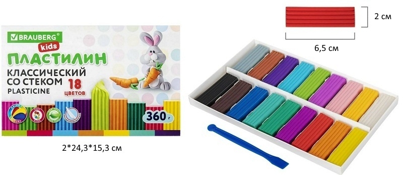 кс_Пластилин классический арт. 106510 BRAUBERG KIDS 18 цв. 360 г, со стекомВид упаковки: картонная коробка 2x24.3x15.3 см