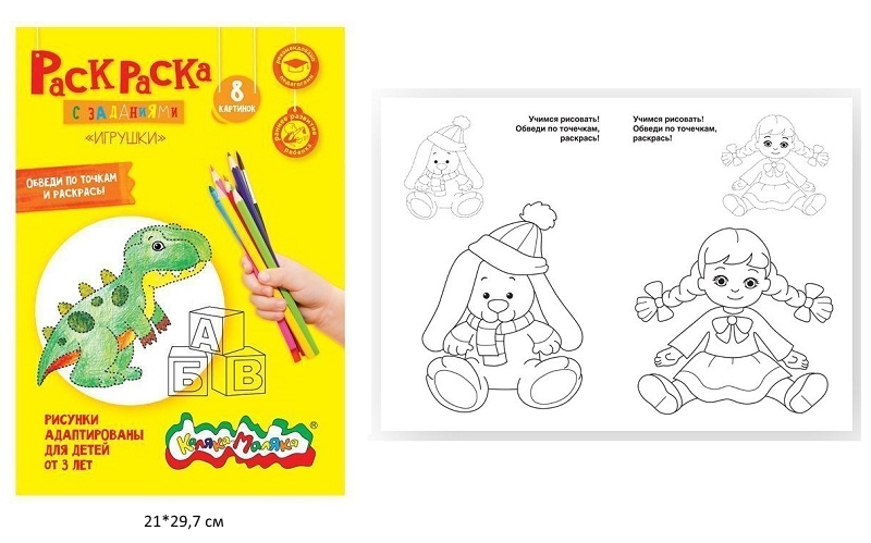 Производство: Россия24.13 руб. 48.26 руб. - км_Раскраска арт. РКМ08-И Каляка-Маляка ИГРУШКИ А4 8 стр. от 3 лет×км_Раскраска арт. РКМ08-И Каляка-Маляка ИГРУШКИ А4 8 стр. от 3 летРаскраска "Игрушки" предназначена для самых маленьких художников от 2 лет: рисунки в ней крупные, без мелких деталей, большие области для раскрашивания, широкий контур, помогающий сделать работу максимально аккуратно. Раскраска содержат понятные, адаптированные для детского восприятия картинки. С помощью этих раскрасок малыши научатся раскрашивать, и смогут создать свои самые первые шедевры. Раскрашивание развивает фантазию, мелкую моторику и прекрасно влияет на психо-эмоциональное состояние ребенка. Яркая глянцевая обложка привлекает внимание и вдохновляет на творчество. А плотные листы позволяют использовать различные материалы для раскрашивания: карандаши, фломастеры, краски.
