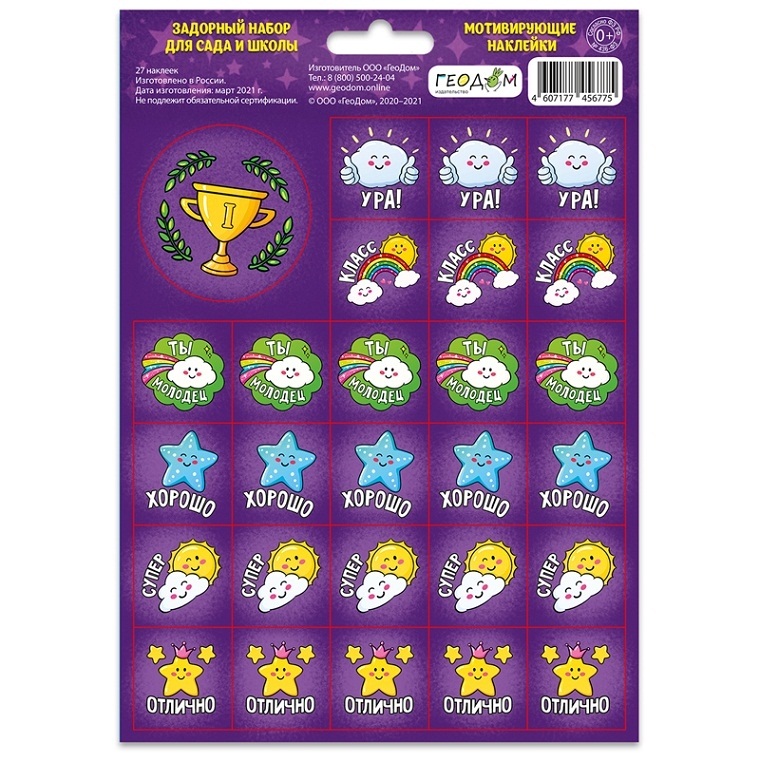 Производитель: Китай3.40 руб. 6.80 руб. - кв_Наклейки мотивирующие арт. 4607177456775 ГЕОДОМ "Задорный набор для сада и школы", 148*210мм×кв_Наклейки мотивирующие арт. 4607177456775 ГЕОДОМ "Задорный набор для сада и школы", 148*210ммБольшое значение для успешного обучения детей дошкольного возраста и первоклассников имеет положительная оценка выполненных ими заданий. Набор наклеек поможет сделать это в игровой форме. Для наклеек использован позитивный и понятный для детей контент. На каждом листе 27 мотивирующих наклеек, и при этом одна из них СУПЕР-наклейка.