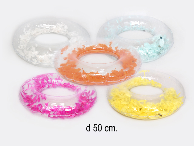 Прозрачный надувной круг для плавания с крупными перьями внутри.