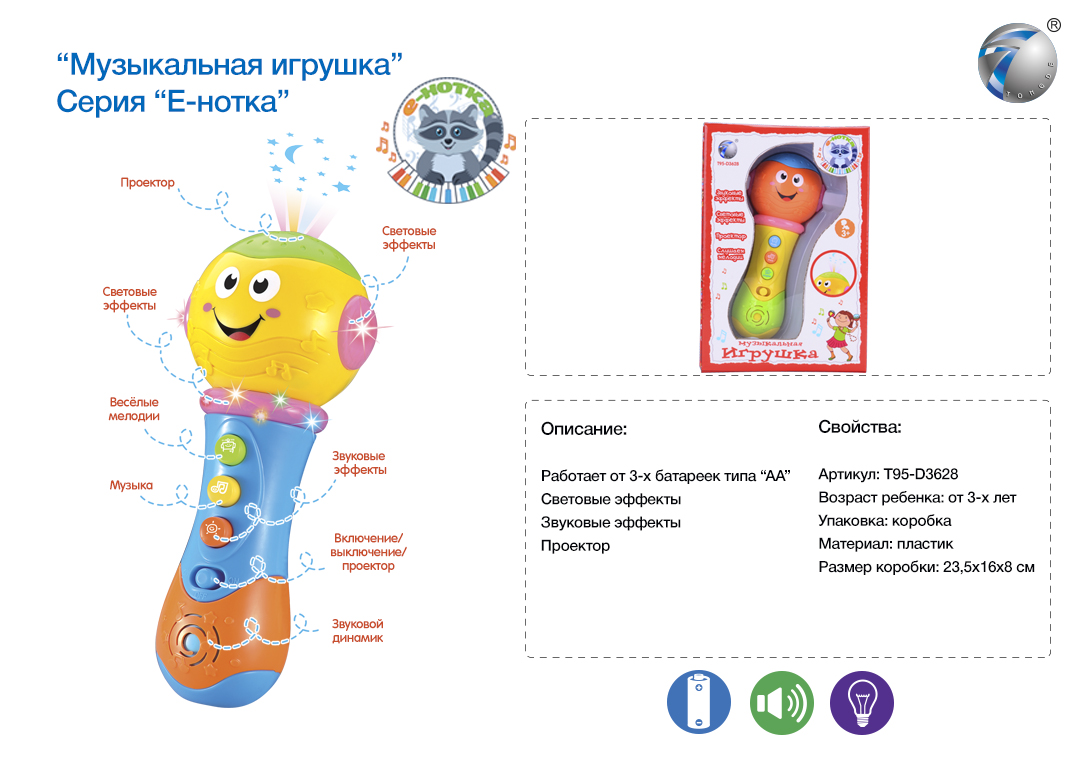 Для включения игрушки нажмите самую верхнюю кнопку на микрофоне. Средние кнопки: одна воспроизводит веселую песенку про алфавит, при нажатии второй кнопки включается микрофон и вы можете говорить в него и петь - Ваш голос будет звучать громко и четко.Самая нижняя кнопка на микрофоне в форме нотки воспроизводит разные мелодии.Все музыкальные фрагменты сопровождаются игрой разноцветных огоньков в верхней части микрофона. Форма микрофона сделана так, что малышу будет удобно держать его в руке и одновременно нажимать на кнопки.