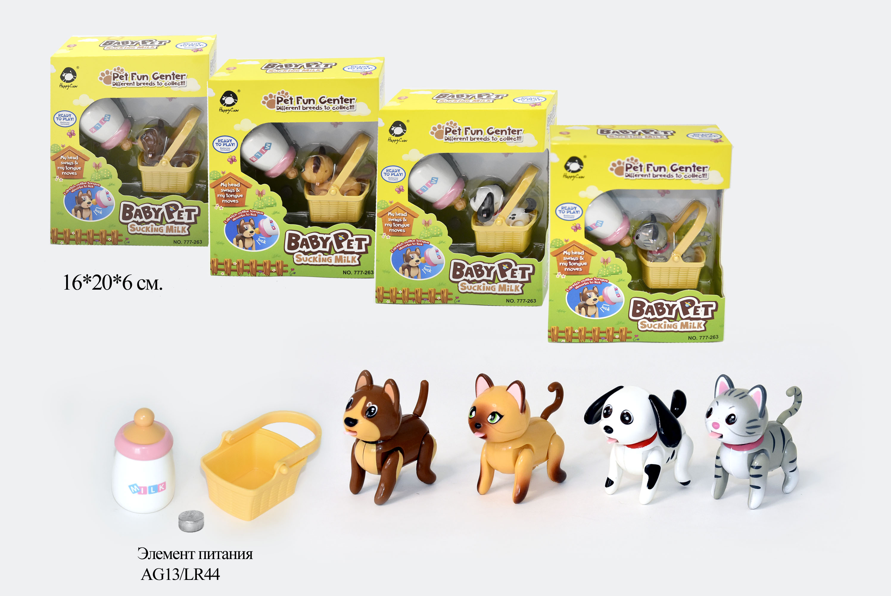 - Котенок арт. 777-263" На бат., лижет соску, в коробке 16 х 20 х 6 /48шт.//бл.24/×Котенок арт. 777-263" На бат., лижет соску, в коробке 16 х 20 х 6 /48шт.//бл.24/Питомец с бутылочкой - прекрасный набор для малыша. Он научит его заботиться о питомце. Игрушка не только оригинально оформлена, но еще и интерактивная. Он как настоящий высовывает свой язычок и лижет молочко. Игрушка учит пониманию причинно-следственной связи, помогает тренировать моторику и координацию движений, восприятие формы и цвета. Функционал: забавные звуки, ходит, «пьет» из бутылочки Размер изделия: питомец – 3х4х6 см, бутылочка – 4х4х7 см В набор входит: питомец, корзинка, бутылочка с молочком (имитация), батарейка. Возраст: от 5 лет Материал: пластик Производство: Китай Размер упаковки: 16 х 20 х 6 см297.21 руб. 594.41 руб.