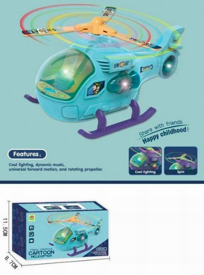 Вертолет арт. 0713 Шестеренки на батар. в кор._/72 шт./Вертолёт самодвижущийся, при возникновении препятствий, автоматически поворачивает в другую сторону. Работает от 3 батареек типа АА (в комплект не входят).